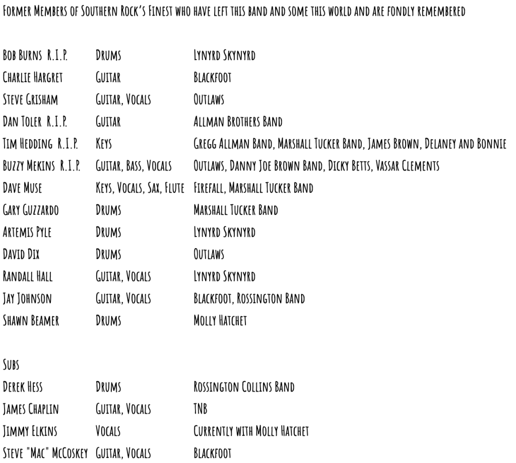 Southern Rock’s Finest features former members of Pure Prairie League, Lynyrd Skynyrd, Molly Hatchet, Gregg Allman Band, Blackfoot, Artimus Pyle Band, Les Dudek Group, and Ghostriders.